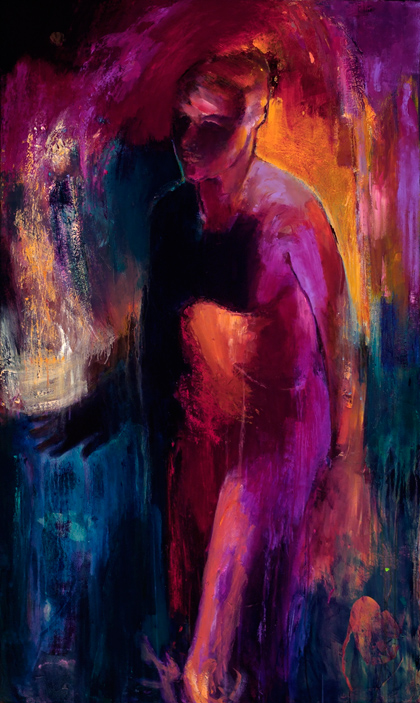 In the paintings of Deanna Schwartzberg, we enter a world of color and light that inspires us to contemplate the shared presence of humanity and the natural world. A figure, often of life size proportions, merges with elements of nature, creating an energy that flows throughout. In the painting “Splush” one senses the wetness of a garden, the darkened silhouettes of abstracted flowers, and the splayed luxuriating of the female form; her face in shadow and locked in its own repose. On further examination the figure does not completely separate from the landscape; Its legs and torso suggesting organic elements as well. Throughout her work, elements of nature combine with body to reaffirm her belief that humankind and the environment are inseparable. Her work compels us to reexamine our relationship with the world that surrounds us.