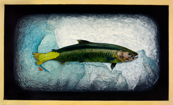 Oftentimes, dead fish are something from which people tend to avert their eyes and attention. This is not the case with Rey’s Aesthetics of Death: VIII, which is an incredibly bold painting that compels the spectator to examine all of its vivid details. The size of the trout in this series is a nod to traditional historical paintings. However, Rey breaks this barrier by diverting the subject matter of the narratives of the historical genre and instead, he makes a contemporary expression of confrontation with death, which features dead and decaying fish. This brightly colored trout looks too colorful to belong to the waters of Western New York State but they have a purpose. These colors are a bold and paradoxical nod to the beauty of life. This series suggests what happens after death and allows each viewer to come up with their own interpretation of a potential afterlife.