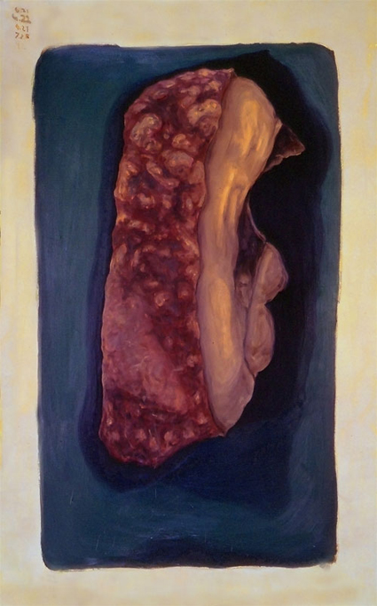 Alberto Rey’s depiction of the fried, pork rind, Chicharrón, which is served as a snack to Cuban children and adults alike, stands out as an example of Cuban simplicity in comfort food. Chicharrónes are commonly served in a paper bag, when sold in stores. For Rey, his painting - Chicharrón - recalls childhood memories from a time when his mother would give him a bag of chicharrónes to keep him busy while she shopped, in Miami’s Little Havana. The monumental image Rey created from his memory will remind Cubans of chicharrónes by recalling, through its size and immediacy, the sensory appeal of the chicharrón and it will bring family memories to all Cubans, no matter where born. For non-Cubans, the painting is an introduction to one of Cuba’s typical foods.