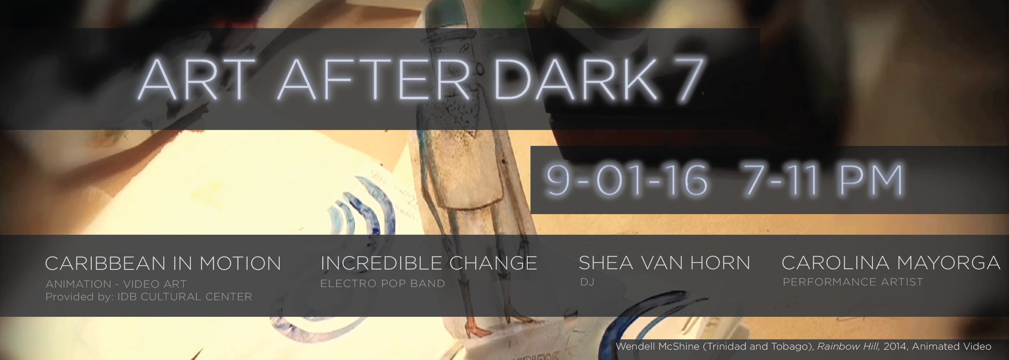 AMA | Art Museum of the Americas of the Organization of American States (OAS) and the Friends of AMA announce Art After Dark 7: Caribbean in Motion. The popular after-hours event brings art and music lovers together for one night to celebrate al fresco in the lush French gardens of the OAS. The main visual backdrop of this year’s event consists of large-scale video art projections on the OAS’s historic building façade, produced by video artists throughout the Caribbean, and selected from a pool of entries by our friends at IDB Creativity. DC’s finest electro-pop band Incredible Change, and Luis Garay Percussion World, will perform live sets. DJ Shea Van Horn will keep the crowd moving throughout the night, and performance artist Carolina Mayorga will present La Vie en Rose-2. The VIP areas also return with a silent auction.